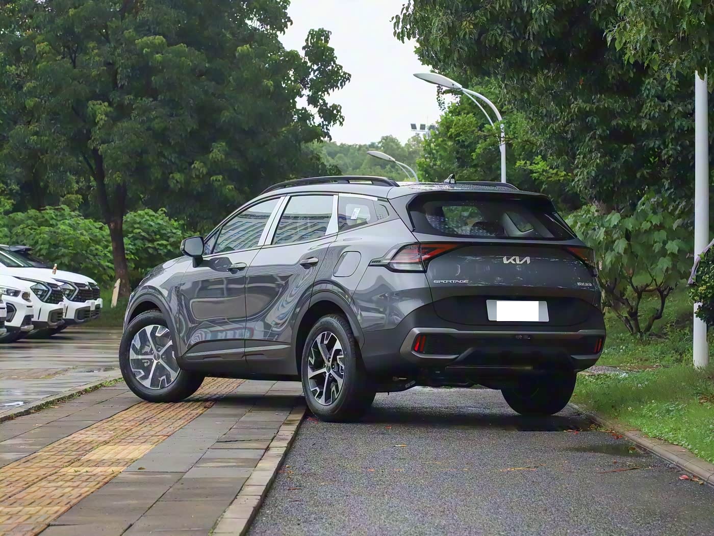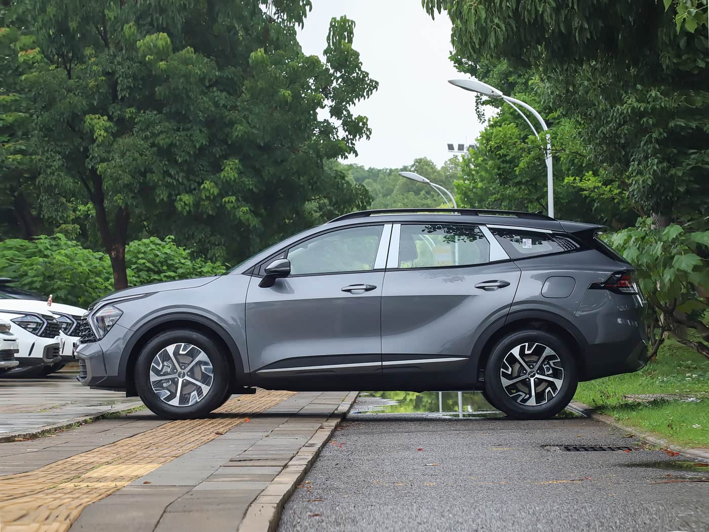 我们首先来看新车的外观设计方面,新款狮铂拓界的车头设计将家族传承与潮流元素完美融合。经典虎啸式进气格栅升级为熏黑菱形网状结构,与两侧回旋镖式 LED 日行灯无缝衔接,形成贯穿式视觉链条,中央高亮 “KIA” 标识在夜间点亮时极具辨识度。分体式大灯组采用 “上灯带下矩阵” 布局,外侧狭长 LED 灯带勾勒锐利轮廓,内侧矩阵式远近光灯支持自适应切换,配合保险杠两侧的 LED 雾灯,雨雾天气可实现 120 米范围照明。功能性与运动感兼顾的设计细节处处可见:引擎盖隆起的双筋线强化肌肉质感,同时优化气流走向提升散热效率;前保险杠下方采用厚实熏黑饰板,搭配两侧导流口设计,既降低风阻又增强运动氛围。