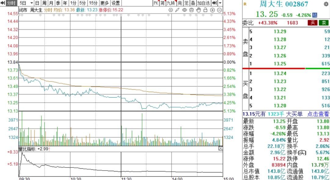 截至11月3日,周大生收盘价为13.25元/股,最新市值约143.8亿元,以1月2日收盘价14.24元/股计算,其年内股价已跌近6.95%,而今年金价涨幅接近50%