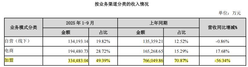 不难看出,加盟店是周大生闭店的“主力军”。这一现象并不意外,数据显示,前三季度公司加盟业务营收同比降幅已高达56.34%。